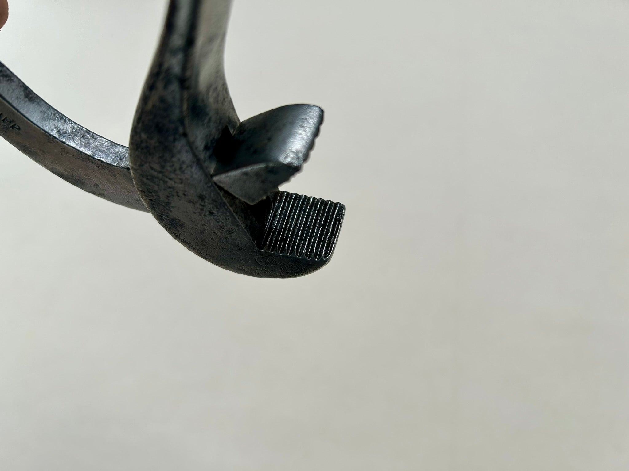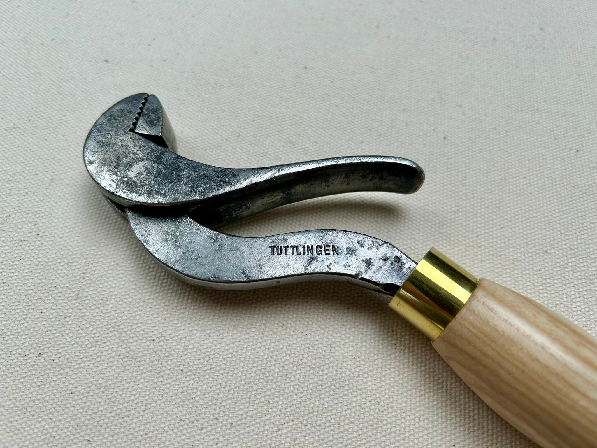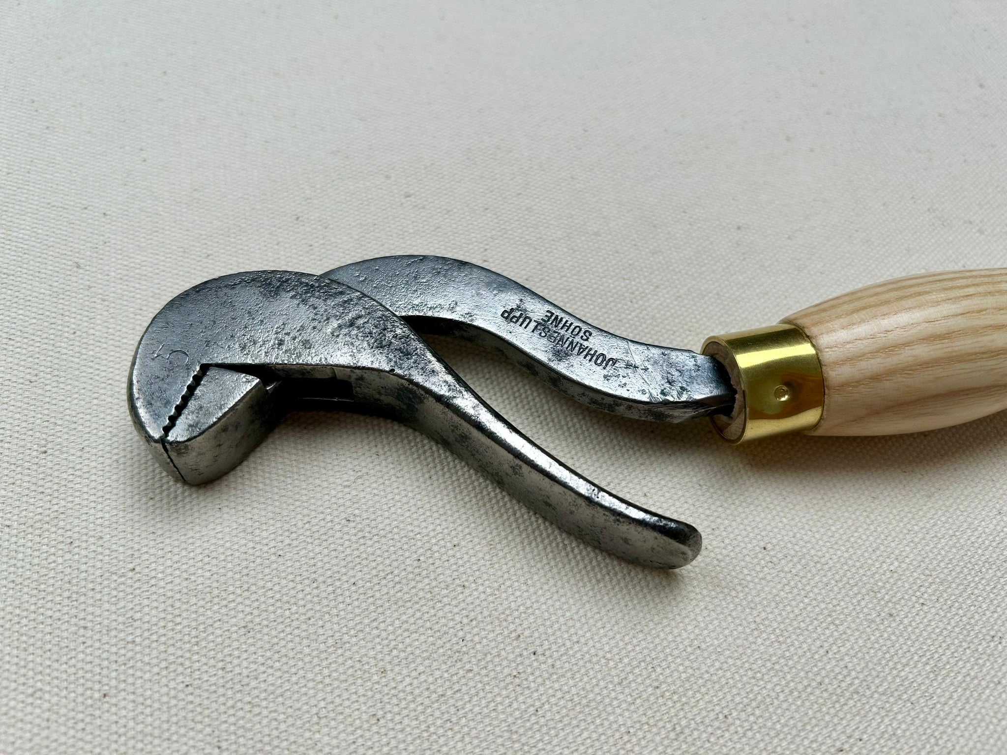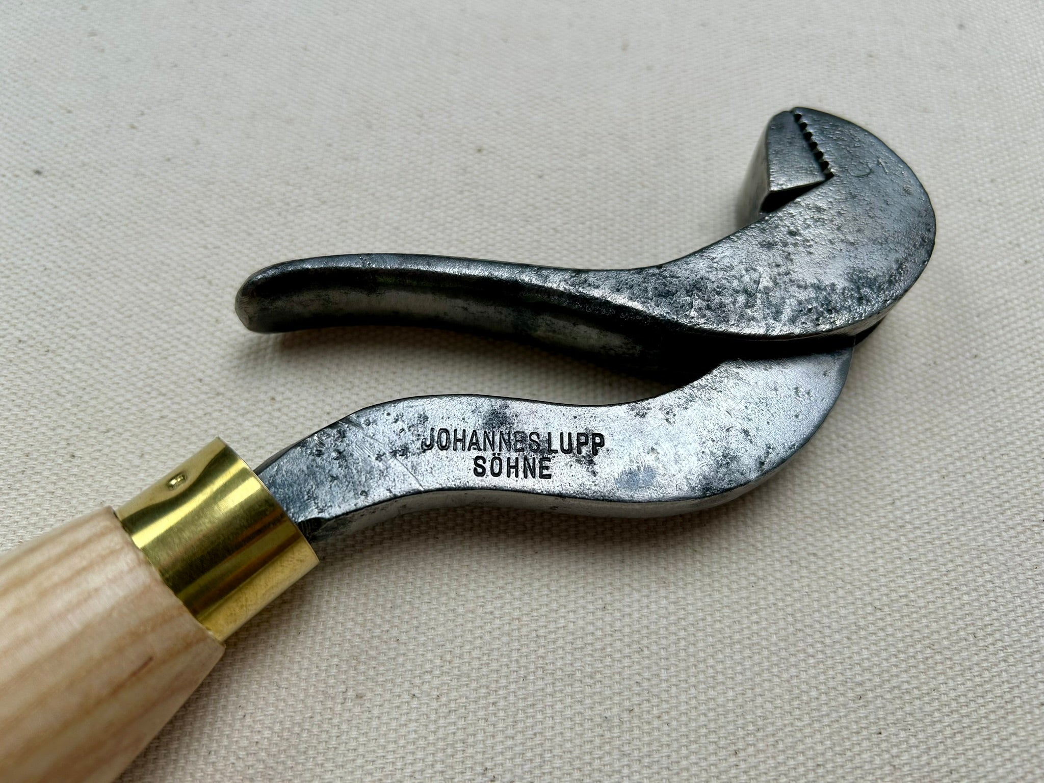 Johannes Lupp & Söhne bulldog lasting pliers made in Tuttlingen, Germany. They are for lasting along the shank, especially on boots. The shape is super convenient because if you're lasting while sitting down, you can throw a leg over the handle and use both hands to tack the upper down while still pulling. This tool makes the lasting process of boots more comfortable and easier.