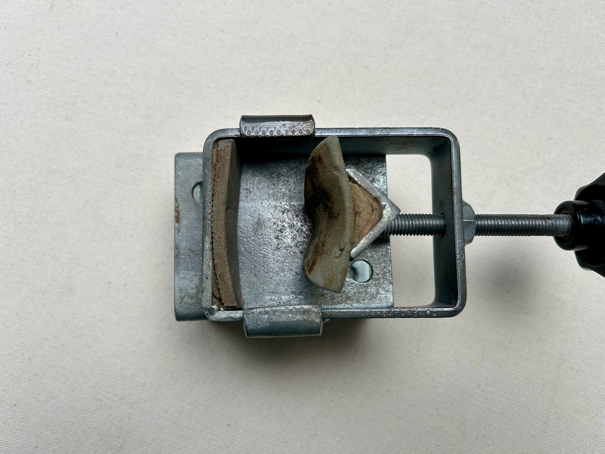 Heel holder for table top mounting. This tool is used to firmly clamp the heel of lady shoes when nailing.