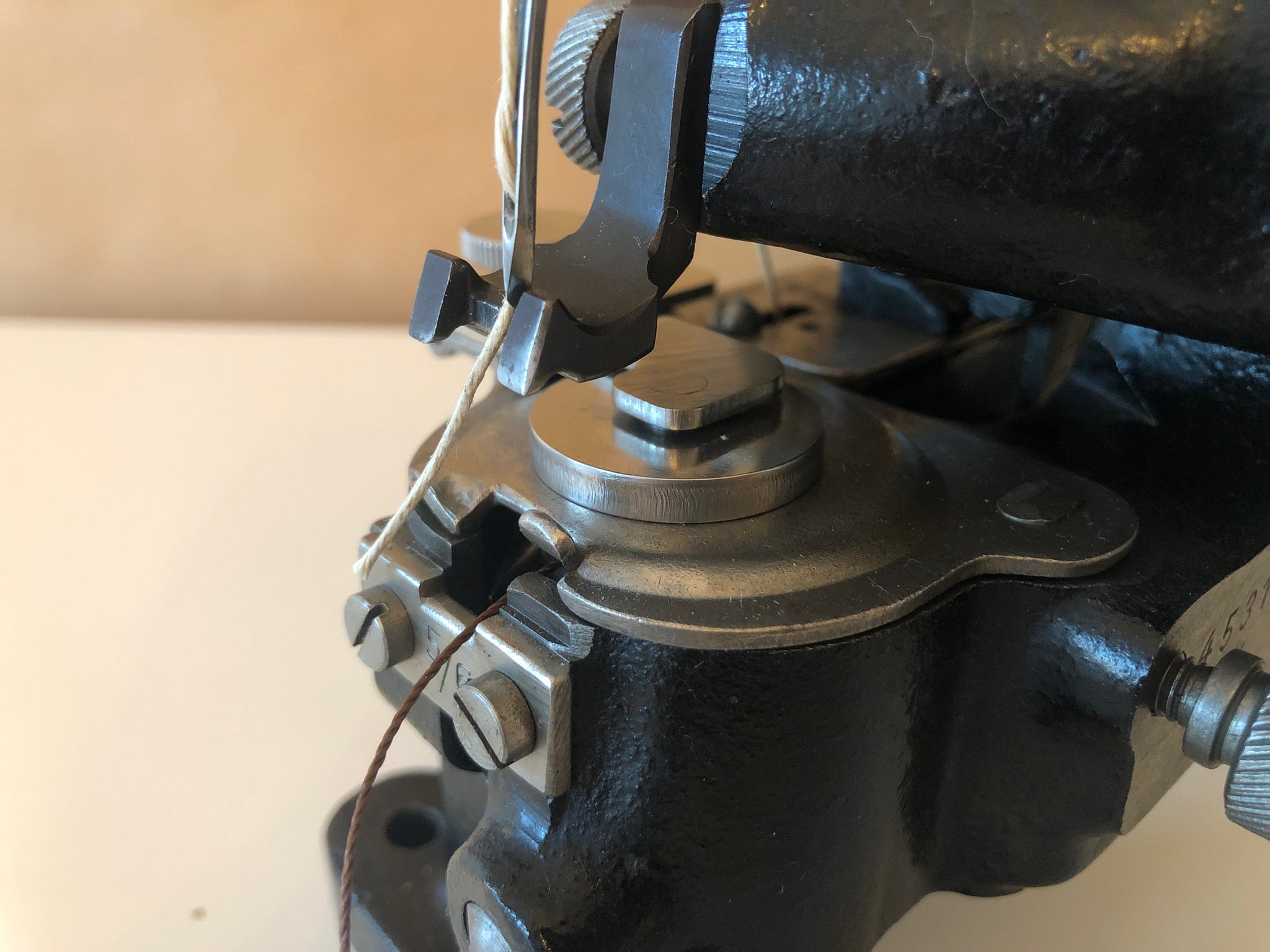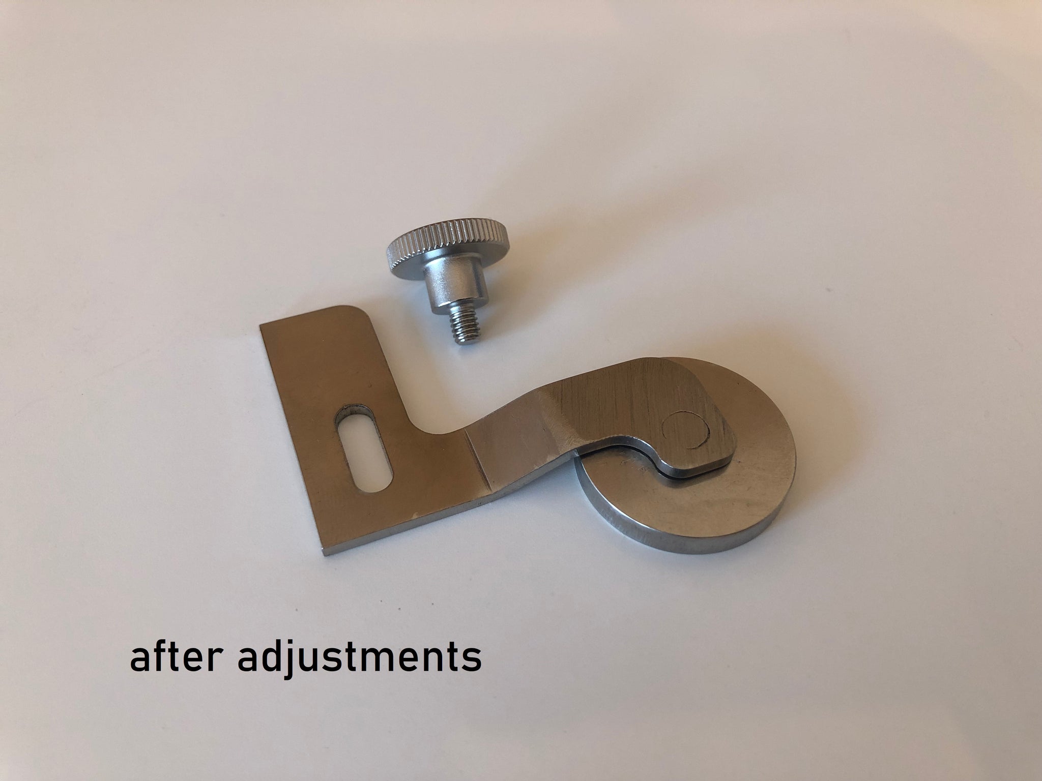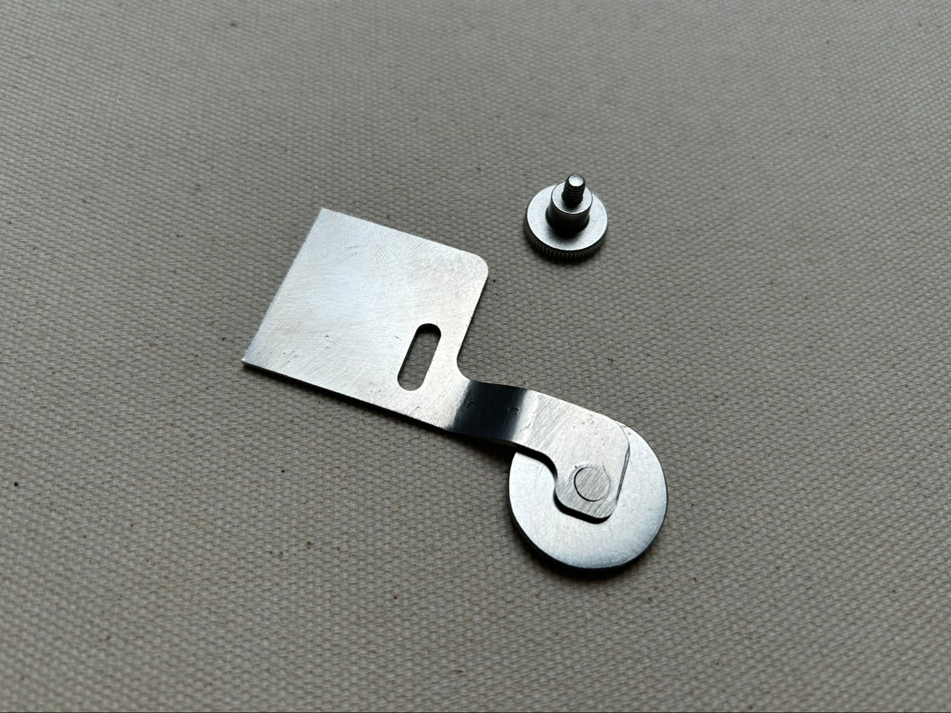 This is a replica of the Junker & Ruh SD28 parallel stop made in my workshop. It guides your shoe or piece of leather to be sewn parallel to the needle. As the base plates of the Junker & Ruh SD28 machines are differing all a little bit, you have to adjust the parallel stop by your own to your base plate.