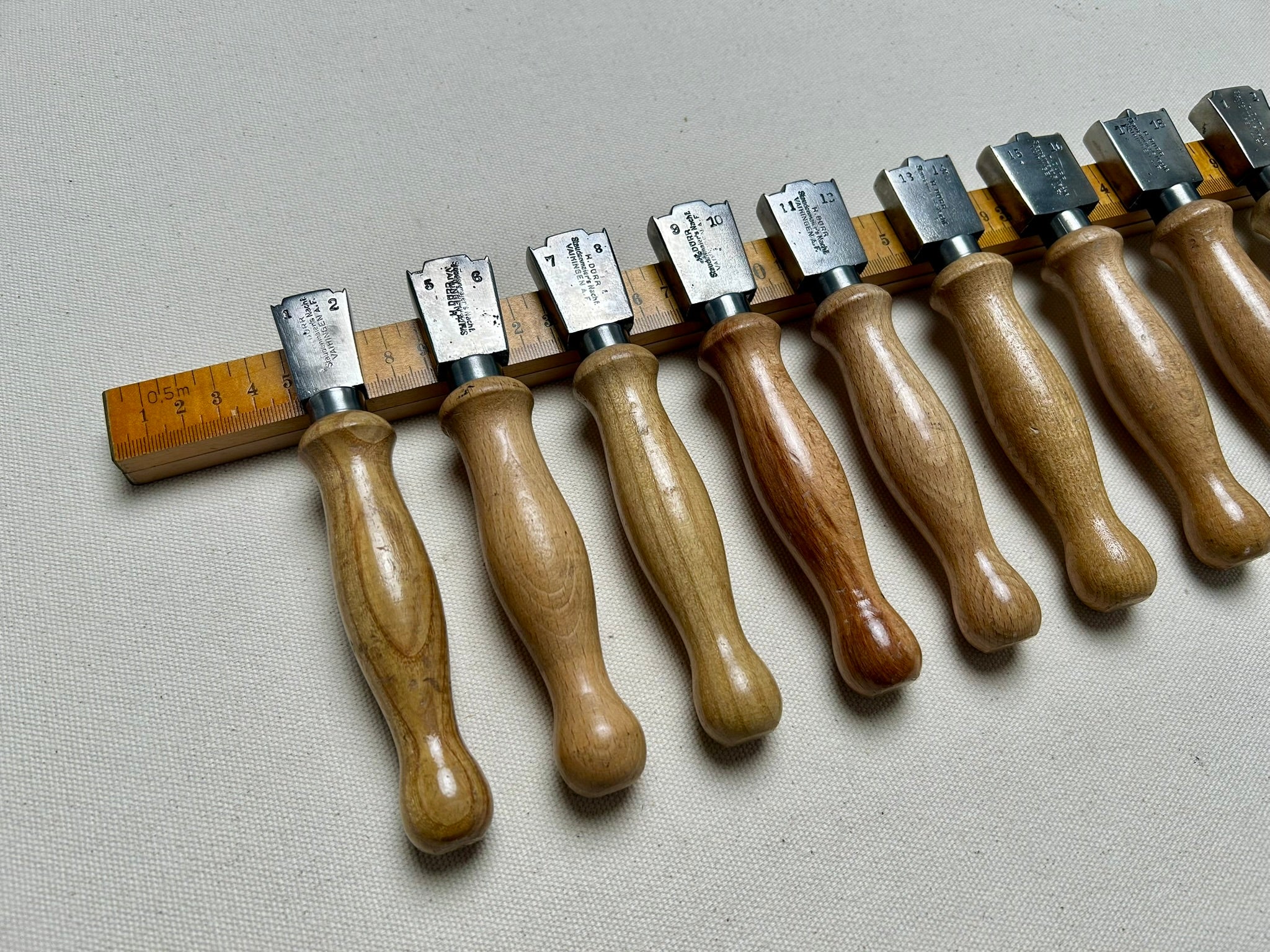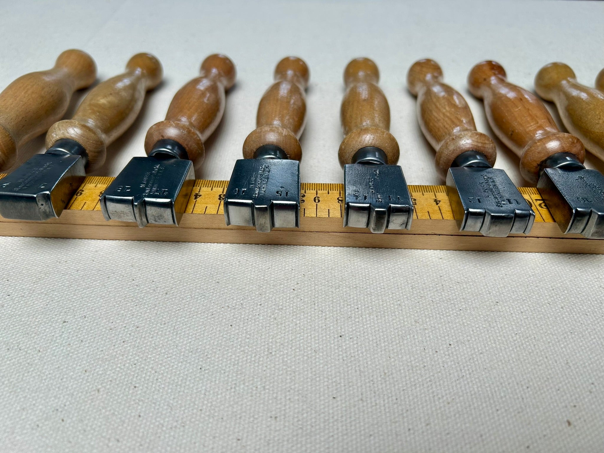 8 x double edge irons with numbers "1" till "18". Iron number "3 - 4" is missing. The width range of the irons goes from 2,0 mm till 11,0 mm.