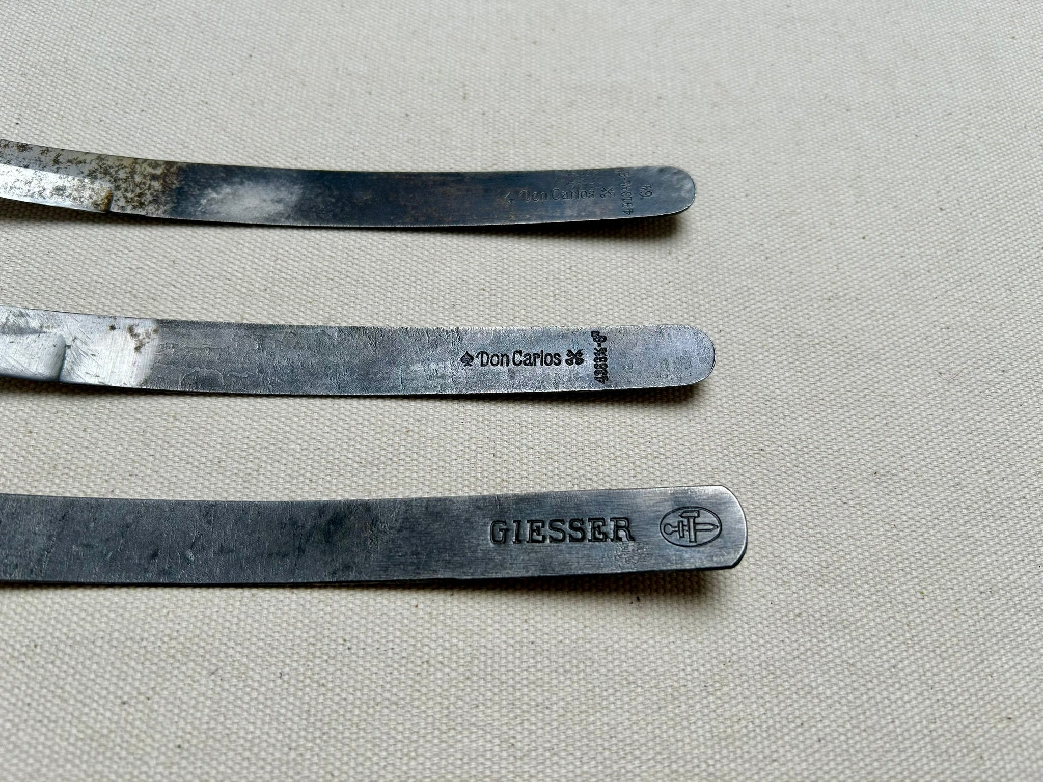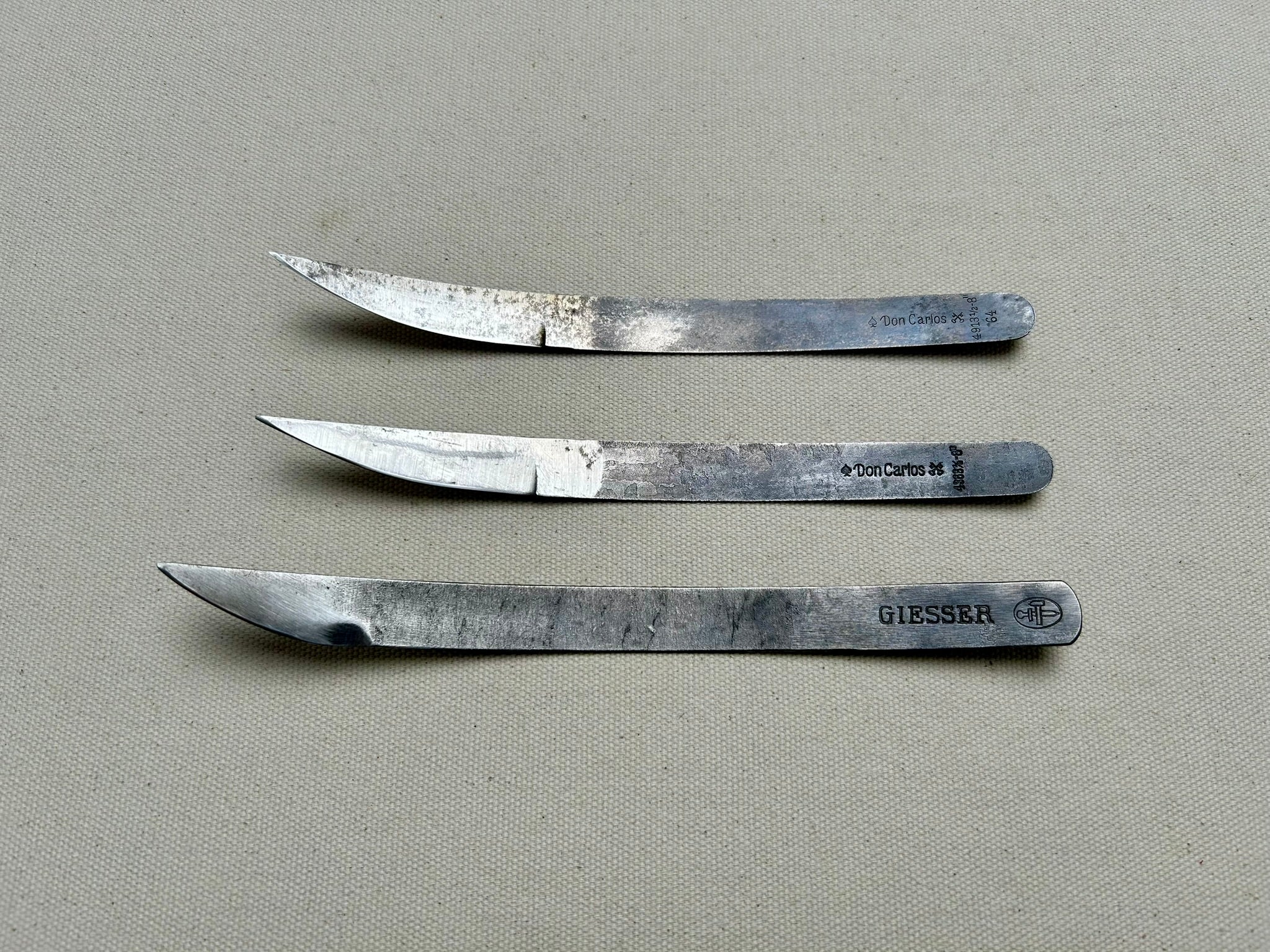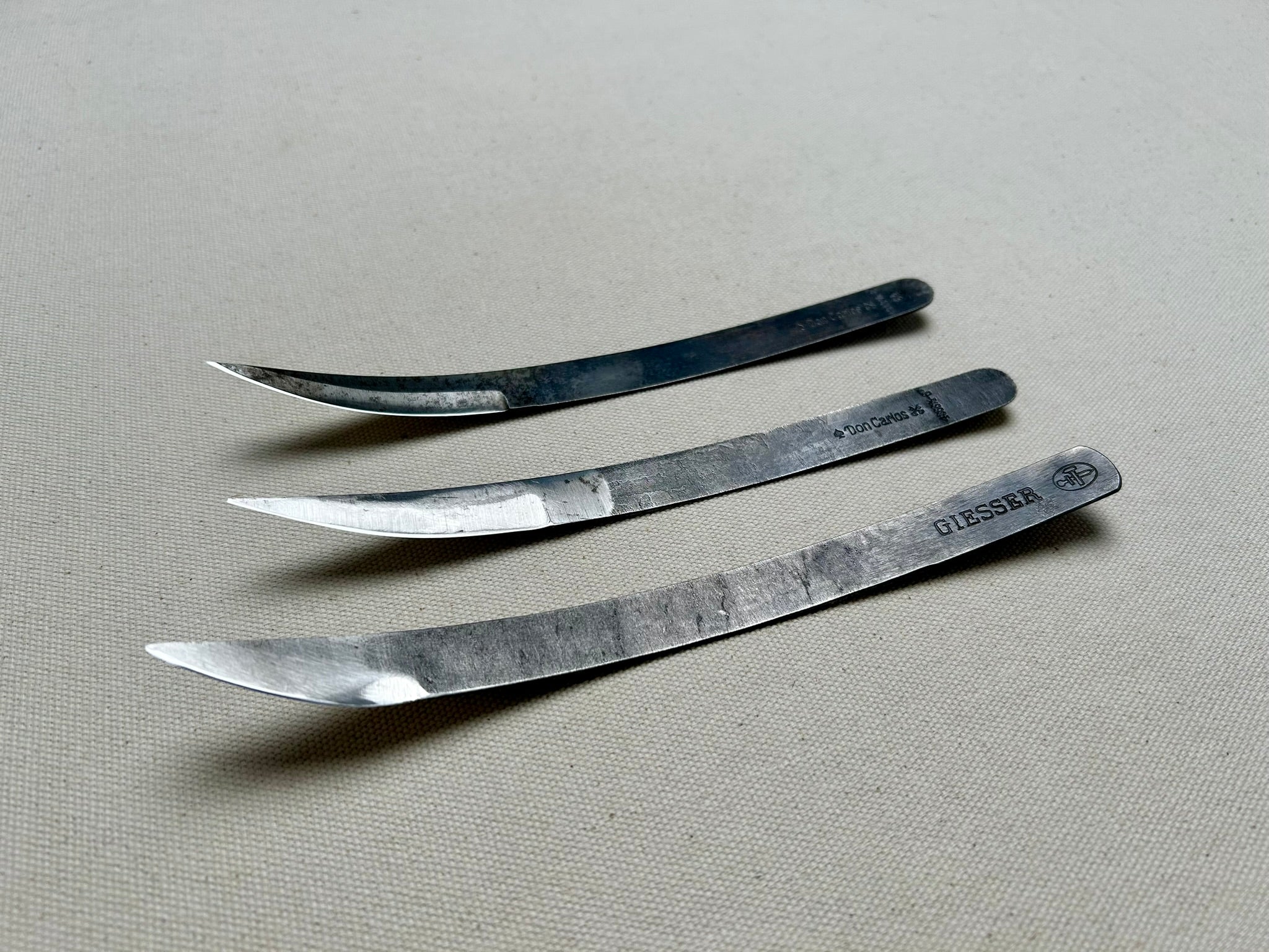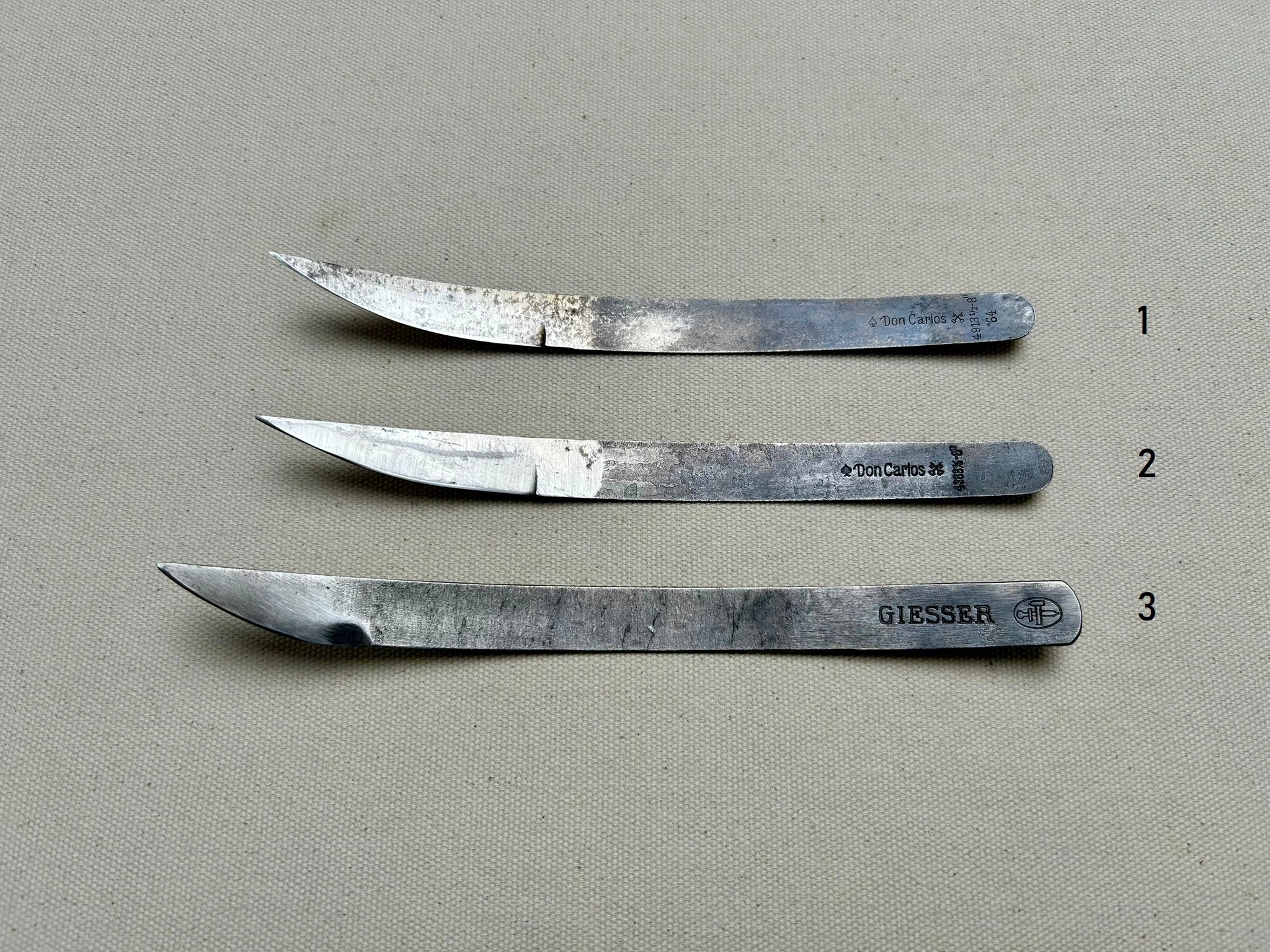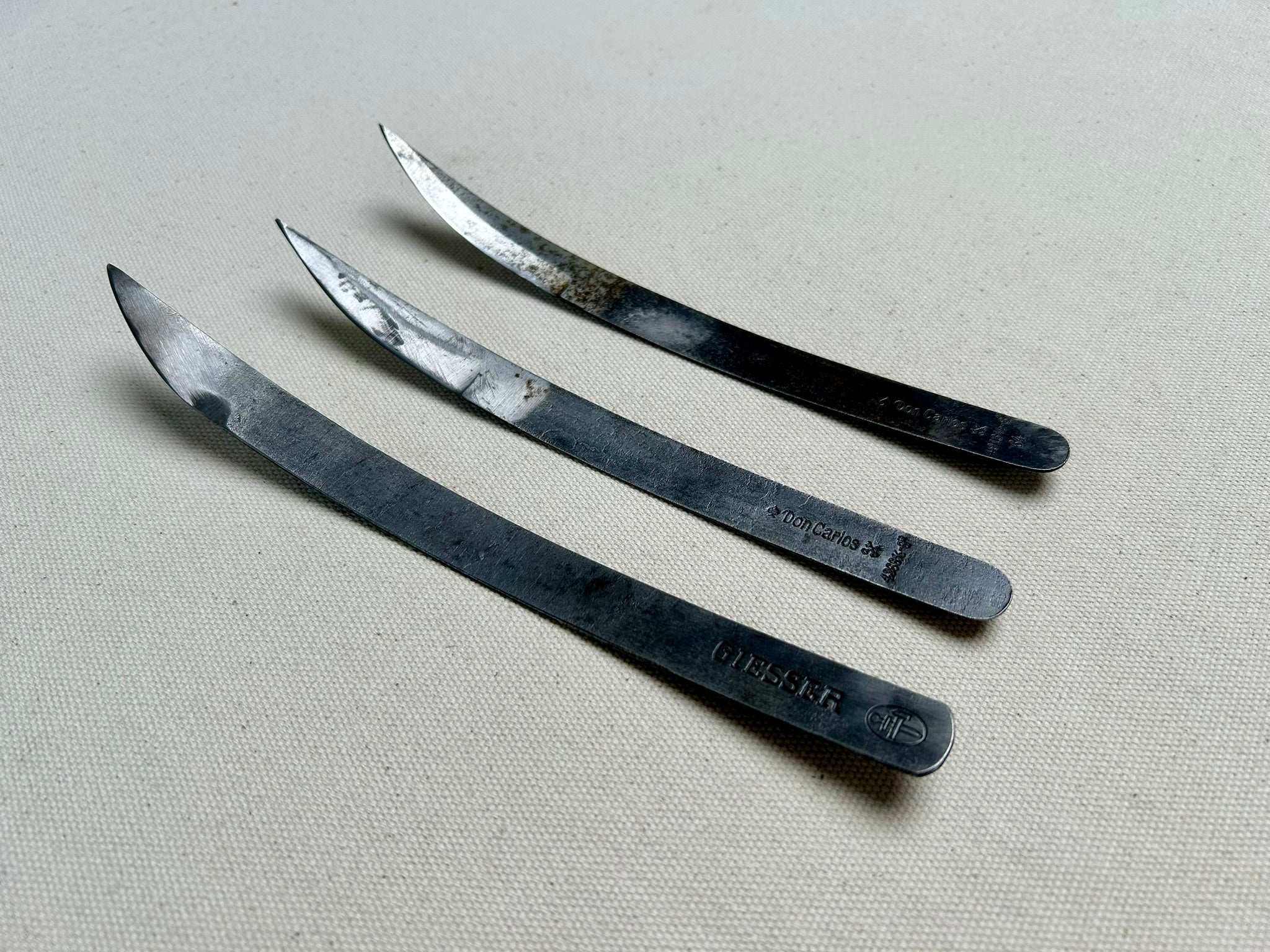 Shoemaker knife for skiving leather. It is used in upper making and to skive out the toe puff and heel counter.