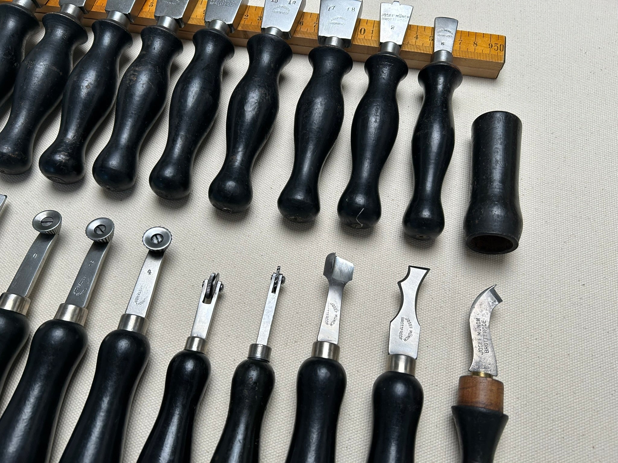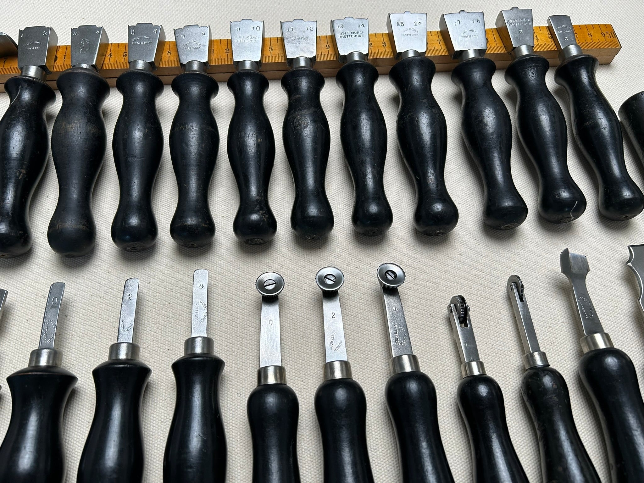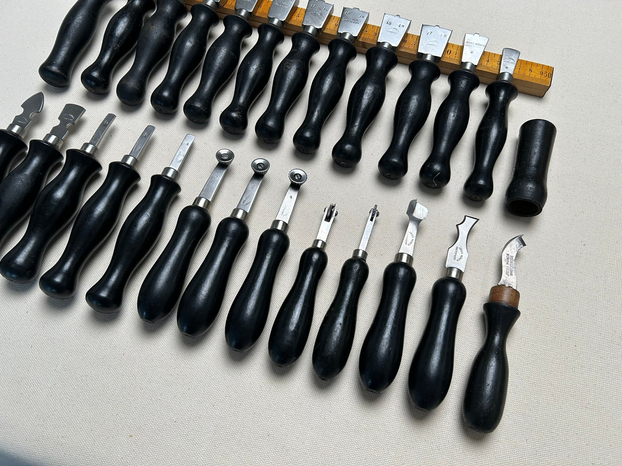 Set of 25 shoemaker tools by Joseph Münch, Brotterode, Germany. The company Joseph Münch produced knifes and shoemaker tools from 1930s until 1945. After war, they where forced by Soviet and East German Government to change the production to general metal hardware. The set includes the following: