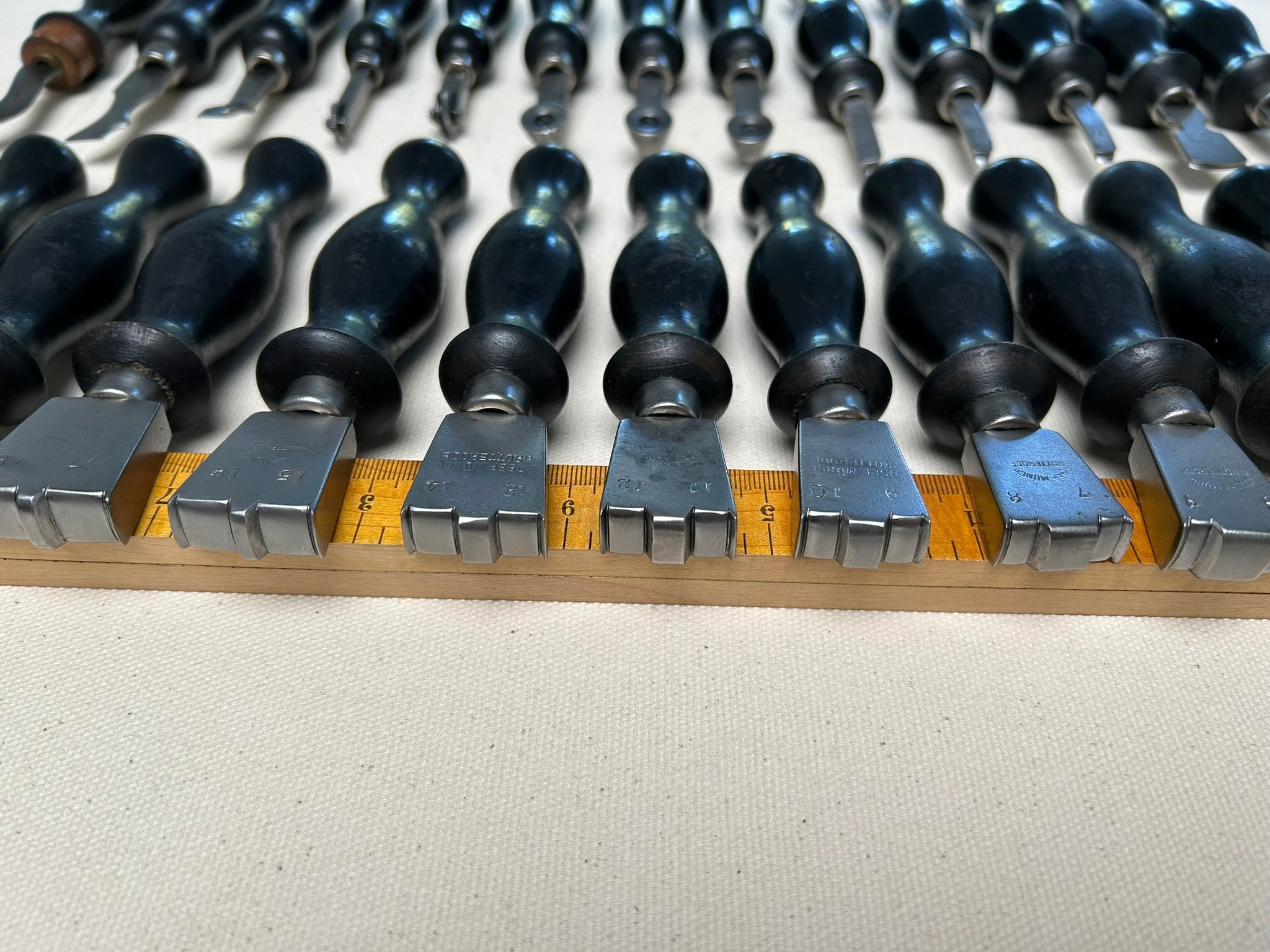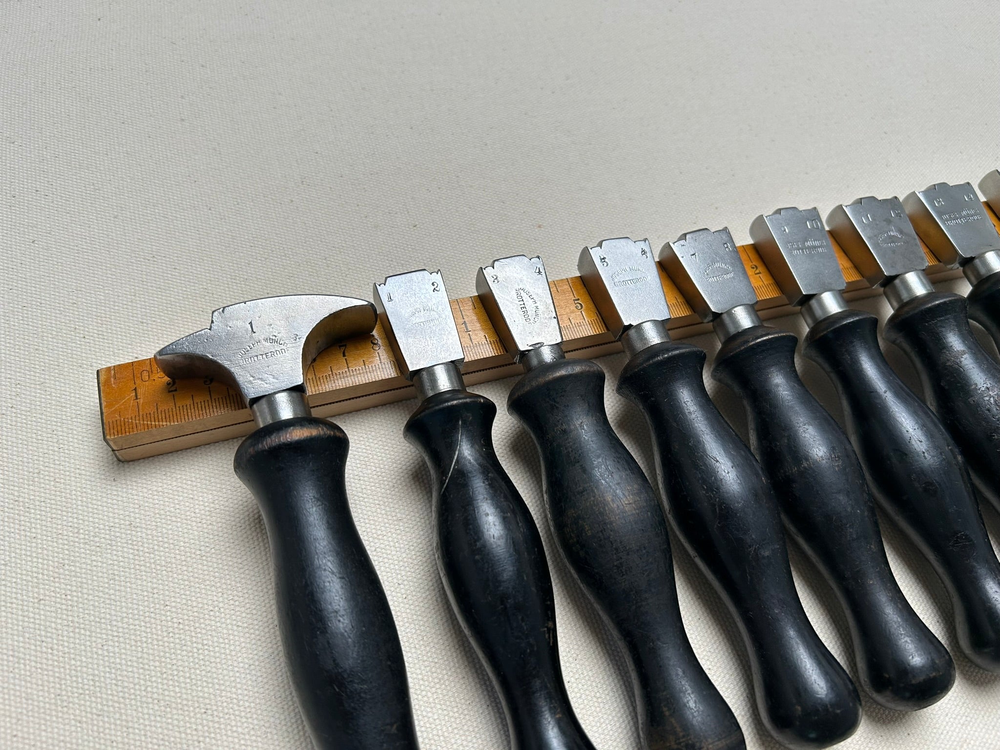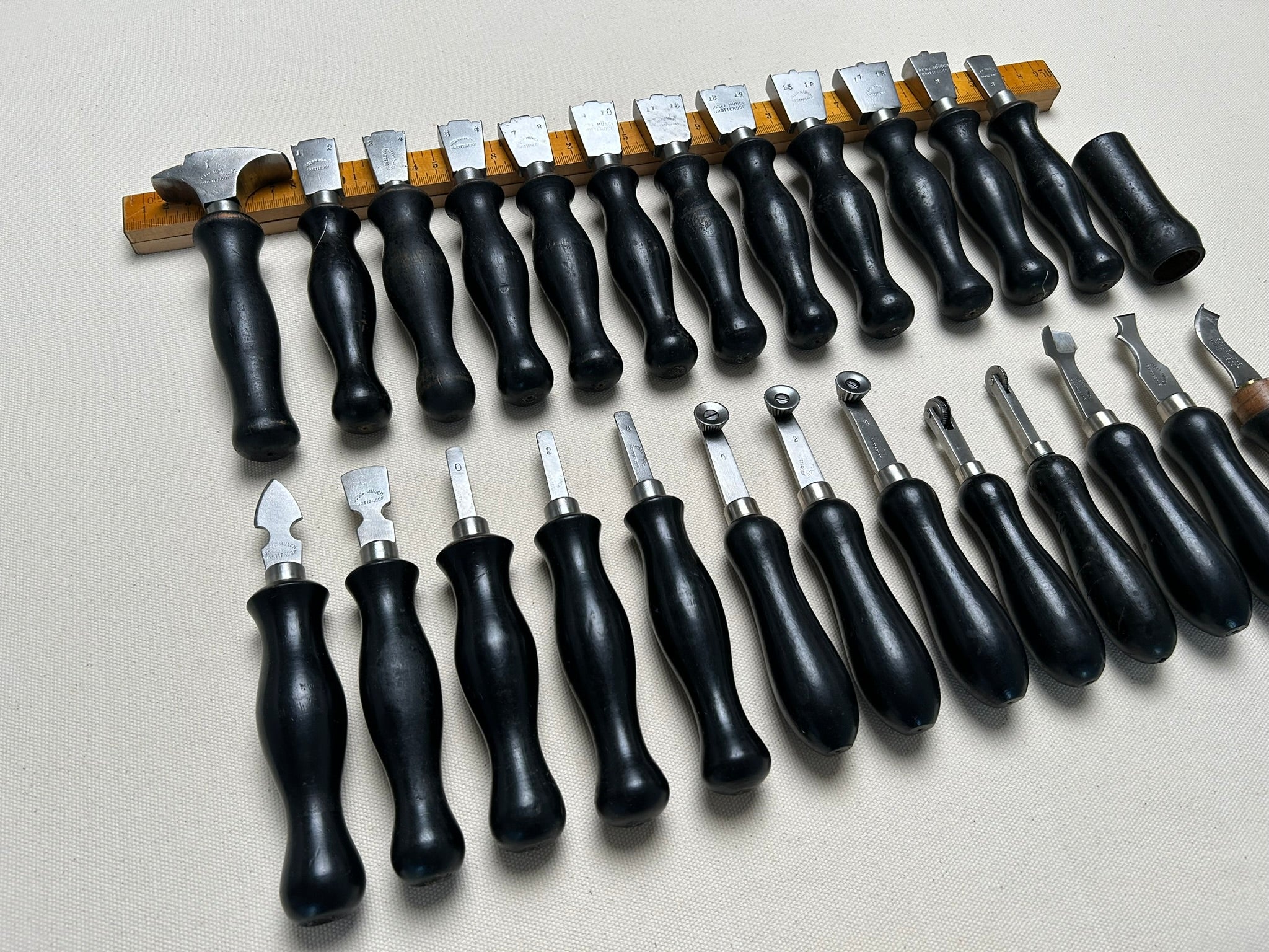 Set of 25 shoemaker tools by Joseph Münch, Brotterode, Germany. The company Joseph Münch produced knifes and shoemaker tools from 1930s until 1945. After war, they where forced by Soviet and East German Government to change the production to general metal hardware. The set includes the following: