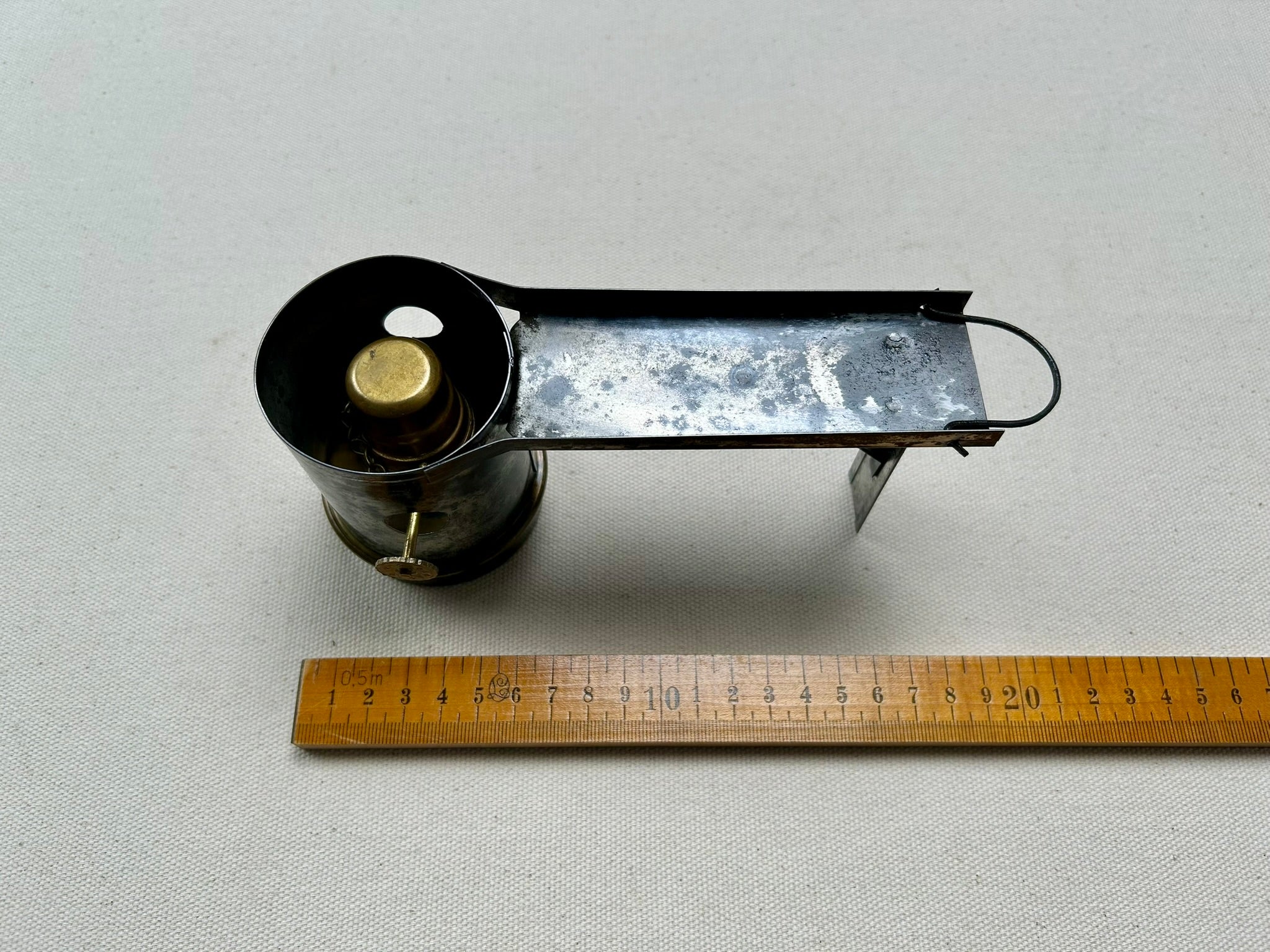 Vintage spirit lamp with brass container. The height of the wick is adjustable.